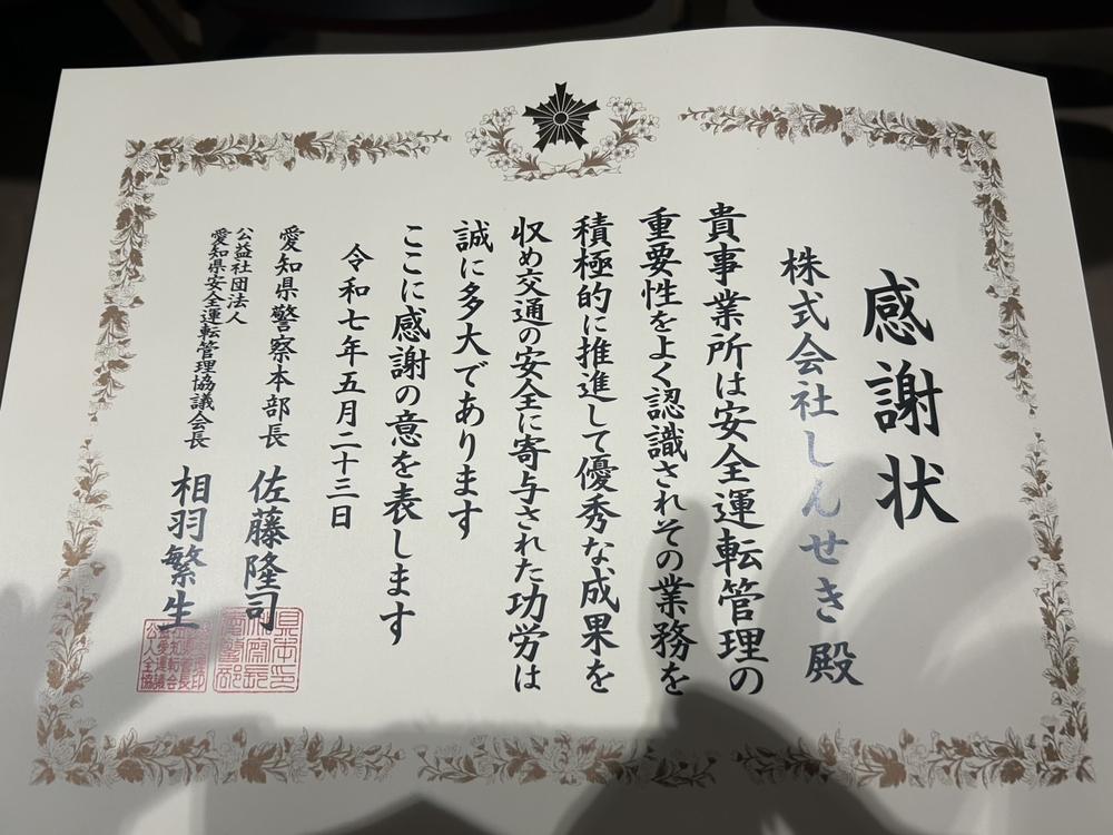 令和7年5月23日、株式会社しんせきが「優良安全運転管理者等表彰式」において、愛知県警察本部より表彰を受けました。